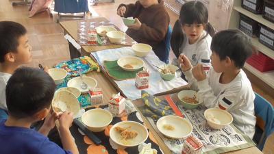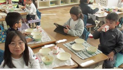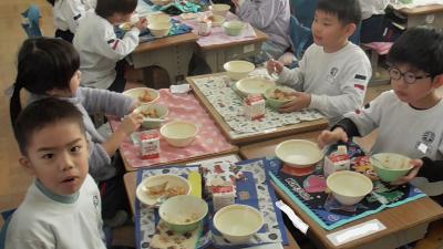 子どもたちに「がんばれ!」の隠れたメッセージを、おいしい「マーボー豆腐」とともに調理員さんたちの思いが子どもたちにも届き、1年生の子どもたちも笑顔いっぱいで給食を食べていました。