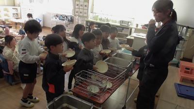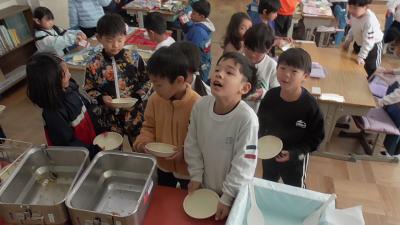 担任の先生の計らいで、餃子じゃんけんを子どもたちと行いチャンスをいただきました。こんなにおいしそうに給食を食べてくれるなんて、本当にうれしい思いでいっぱいです。
