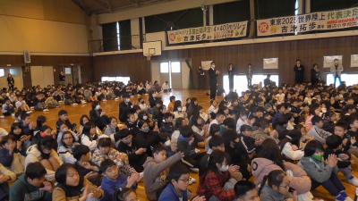 東京2025世界陸上の混合4×400mリレー日本代表チームメンバーとして出場し、日本新記録達成、決勝進出8位入賞の偉業を達成するとともに、男子4×400mリレー日本代表チームメンバーとして出場した、磯辺小出身吉津拓歩選手が、10月31日(金)に磯辺小に来ていただきました。世界陸上8位入賞をお祝いするとともに、「愛知・名古屋2026アジア競技大会」の出場を目ざす吉津拓歩選手にエールをお届けする会を開催しました。これからも世界の舞台で活躍する吉津拓歩先輩とともに「夢に向かって」走り続けていきたいと思います。