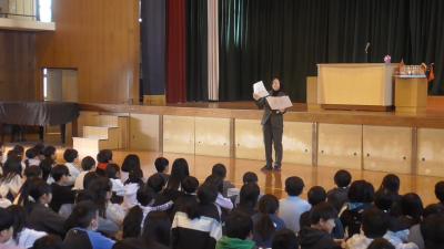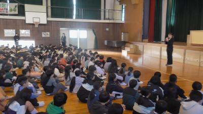 終業式を終え、冬休みの生活で一番大切な「交通安全」について、担当教員からお話をしました。大切ないのちを守るために、交通ルールを守ること、自転車に乗るときにはヘルメットをかぶることなどについて子どもたちに伝えました。
