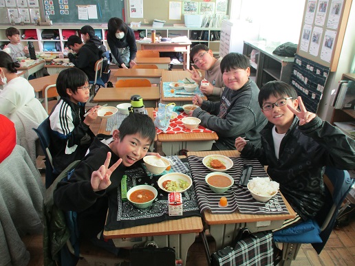 今日の給食は、ごはん、牛乳に、そえやさい(コマツナ、もやし、キャベツ)mさばのてりやき、肉じゃがでした。確かの「肉じゃが」は、忘れらられない母の味として有名ですが、比較的、ふつうのメニューでありますが、子どもたちはすてきな笑顔を見せてくれます。