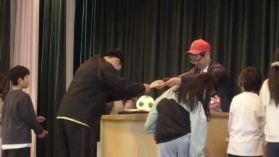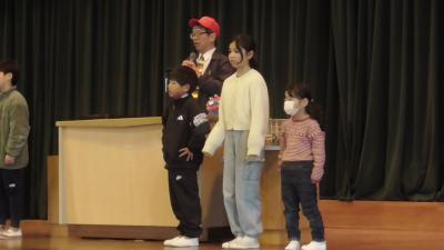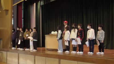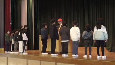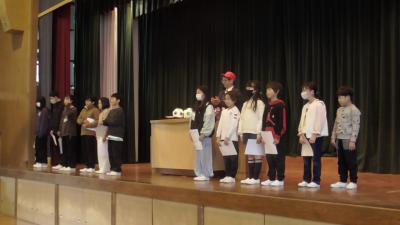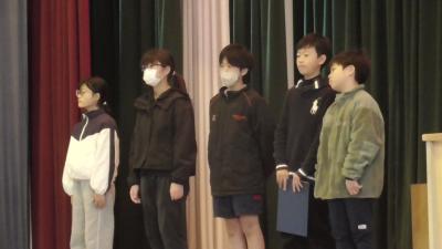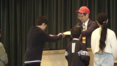 始業式を行う前に、12月17日(水)に行った「ランランチャレンジ」の「チャレンジ部門」(校内特設800mコース)での1~10位入賞者の表彰、夏休み応募作品、第16回ESD大賞優秀賞などの関係児童の表彰披露を行いました。