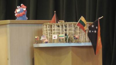 「愛知県ユネスコスクール交流会」成果物展示 大屋根リング、ミャクミャク貯金箱制作
