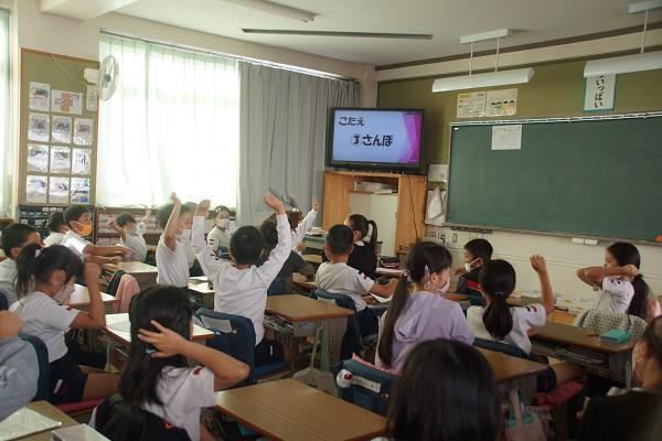 10月20日(木)授業前に歌声集会がありました。歌声委員会の子たちが、事前に用意しておいたイントロクイズを校内テレビ放送で流しました。答えが発表されると、教室では、歓声が上がっていました。楽しい時間になりました。