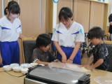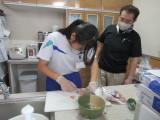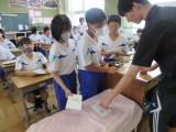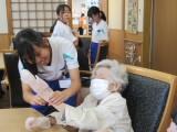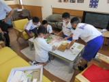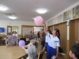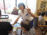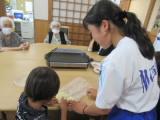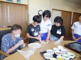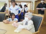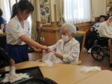 7月22日(月)の午後には3年生が2名、1年生が5名参加してくれていました。この日は、高齢者の方々と風船でバレーをしたり、一緒にピザ作りをしたりしました。ビニル手袋がうまくはめられないおばあちゃんに、生徒が横に座って笑顔で一本一本の指に優しく入れてあげている光景は微笑ましく、じんわりと心が温かくなりました。施設のかたからは、「おじいちゃんもおばあちゃんも普段見ることのできない笑顔をしています。やっぱり子どもが来ると嬉しいみたいですね」と言っていただきました。園児や小学生との交流はありますが、普段はなかなか関わることの少ない高齢者のかたとの交流は、どんな手助けが必要なのか、どんな言葉かけをするとよいのかなど、多くのことを学ぶ機会になりそうです。