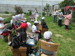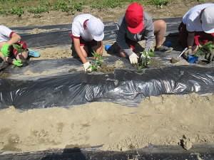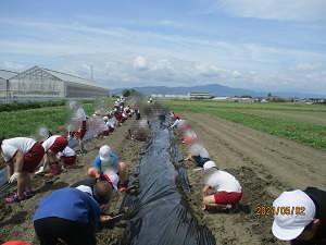 大村小学校の北側にあるみのりファームで野菜を育てます。農業ボランティアの皆さんが畝をつくってくださったので、5,6年生がマルチをはりました。今年は、勢いよく伸びる雑草対策で、畝と畝の間に防草シートもはりました。連休明けには、一人一苗で野菜の苗を植えました。なす、ピーマン、トマト…。今日は、1年生の子が、ペットボトルに水を入れ、「野菜を育ててきまあす」と水やりをしていました。水だけでなく、子どもたちの愛情を受けて、おいしい野菜が育つことでしょう。