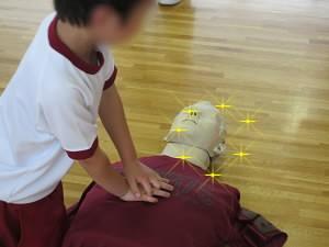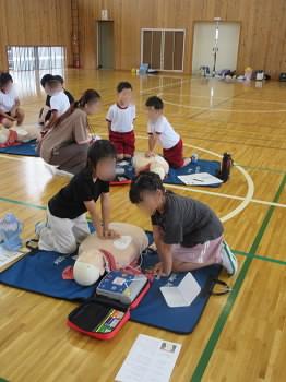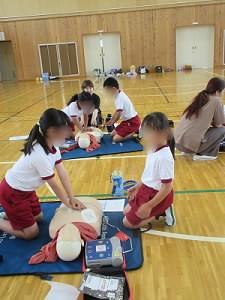 放課後の体育館をのぞいたら、「のびるんdeスクール」の日で子どもたちが体験活動をしていました。今日は、ハートセンターの先生が講師で、ADEを使って心肺蘇生法を体験していました。リズムに合わせて心臓マッサージをしたり、「はなれて」と大きな声で叫んだりして命を守るために何をすればいいかを真剣に学んでいました。