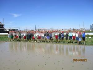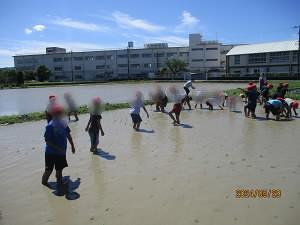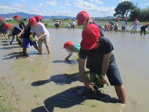 5年生が田植えをしました。昨日の大雨で田んぼの水は冷たく、少し深さもあるようでした。最初は、「いやあ」とか「キャー」とか声を出しながら、田んぼに入るのをためらっていました。入ってしまえば、すぐに慣れて、泥に足をとられる子やしゃがんだ時におしりに泥水がついてしまった子、「泥パック~」と言って両腕と足に泥を塗っている子までいました。終わった時には、「ずっと田んぼに入っていたい」という子もいました。子どもたちの愛情で、秋にはおいしいお米がとれることでしょう。