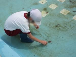 暑くなってきました。来週には、5,6年生のプール掃除があります。徐々にプールの水を抜き、今日は小プールの水がなくなってきました。そのタイミングで3年生がヤゴの救出を始めました。プールにたまった落ち葉をすくうと葉の陰にもにょもにょと動く生き物がたくさん。