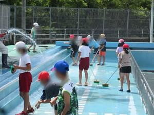 5,6年生が、プール清掃に取り組みました。今年度も大村校区消防団が協力してくださいました。プールの底には落ち葉や泥がいっぱい。5年生が、小プールとプールサイドを、6年生が大プールを掃除しました。消防団のかたが流してくれる水を利用しながら、デッキブラシやたわしでこしこし。プールがみるみるきれいになりました。プール開きは19日(水)。今年も安全に水泳指導を行いたいと思います。消防団の皆様、お手伝いに来てくださった保護者の皆様、ありがとうございました。