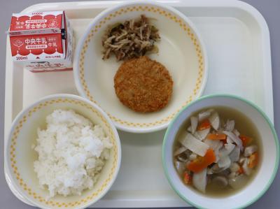 今日の給食はごはん、牛乳、肉豆腐、さつまいもコロッケ、もやしとこまつなのおかかいためです。肉豆腐に入っている豚肉は体を作る働きや疲れをとる働きがあります。野菜といっしょににとることで肉だけではとることができない栄養をとることができ、より健康な体を作ることができます。