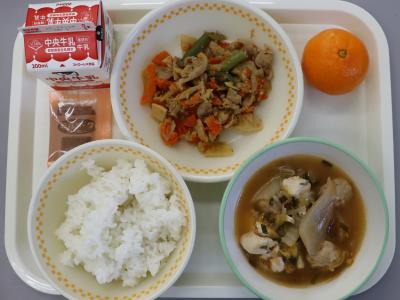今日の給食は、ごはん、牛乳、オイスターソースいため、ピリ辛スープ煮 、味付乾燥豆腐です。ピリ辛スープ煮には、愛知県産の「アカモク」という海藻を使っただんごが入っています。味付乾燥豆腐は愛知県産のふくゆたかという大豆を使って作ってあります。よくかんで食べましょう。