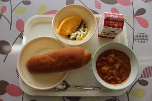 今日の給食は、ミルクロール、牛乳、ほうれんそう入りオムレツ、ベーコンとやさいのソテー、ハヤシシチューです。ベーコンとやさいのソテーのキャベツやコーンには、ビタミンCや食物繊維が多く、お腹や肌の調子をよくするなどの働きがあります。