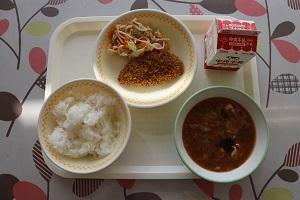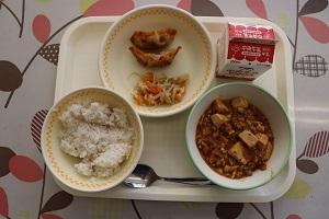 今日の給食は、麦ごはん、牛乳、マーボー豆腐、やさいとはるさめのオイスターソースいため、さつまいもチップスです。マーボー豆腐は中国四川省で生まれた有名な豆腐料理です。中国のマーボー豆腐は、トウバンジャンや山椒など辛い調味料を多く使うのでとても辛いです。給食のマーボー豆腐は、主に赤みそやケチャップで味をつけるのであまり辛くありませんが、トウバンジャンを少し加えたり、にんにく、しょうがなどを使ったりして、本格的に仕上げています。