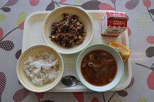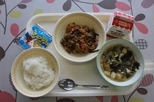 今日の給食は、ひじきとツナのそぼろ丼、牛乳、豚汁、小魚です。豚汁には、豚肉、油揚げ、やさいが入っています。体をつくる食べ物、体の調子を整える食べ物がバランスよく含まれています。特に豚肉には、夏バテを防止してくれるビタミンが含まれています。味わって食べてください。
