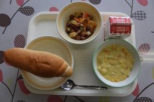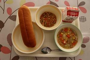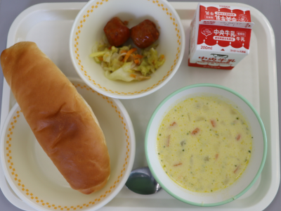 今日の給食は、ホットドック、牛乳、かぼちゃのポタージュスープです。かぼちゃはカロテン、ビタミン、食物繊維などが含まれていて、体の調子を整え、病気を防ぐ働きがあります。給食では、かぼちゃの他にも豆乳、牛乳、生クリームなどが入っており、栄養たっぷりなスープです。