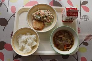 今日の給食は、ごはん、牛乳、あじの青のりフライ、切干しだいこんとひじきのサラダ、ながいものみそ汁です。ながいものみそ汁に入っているながいもには、食物せんいがふくまれ、お腹の調子がよくなります。あじの青のりフライは、骨に気をつけて、よくかんで食べましょう。