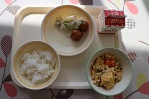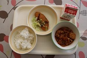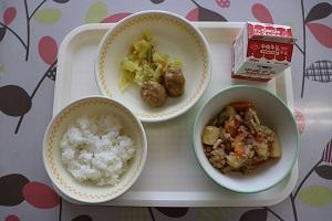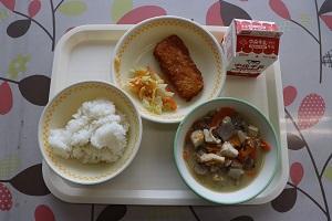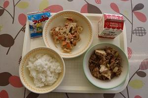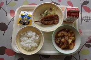 今日の給食はごはん、牛乳、肉豆腐、さつまいもコロッケ、もやしとこまつなのおかかいためです。肉豆腐に入っている豚肉は体を作る働きや疲れをとる働きがあります。野菜といっしょににとることで肉だけではとることができない栄養をとることができ、より健康な体を作ることができます。