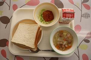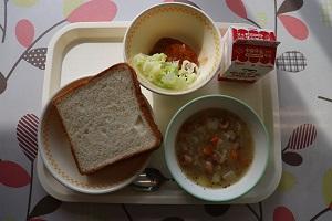 今日の給食は、ハンバーグサンド、牛乳、ポトフ、一口洋なしゼリーです。ポトフは、フランスの家庭料理で、「火にかけた鍋」という意味があります。汁のすき通った煮物の一種で、大きく切った肉や野菜を、セロリなどの香りのよい野菜と一緒に長い時間、じっくり煮込んだ料理です。野菜をたっぷり食べることのできる献立です。