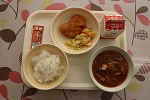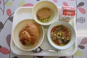 今日の給食は、ごはん、牛乳、キャベツミンチカツ、そえやさい、とうがんの米粉カレースープです。とうがんの米粉カレースープには、豊橋産のとうがんが入っています。豊橋市は全国でもとうがんの産地として有名です。あっさりとした味のため、スープや煮物、いため物など、いろいろな味をしみこませておいしく食べることができます。また、水分を多く含んでいるため、体を冷やす働きがあります。