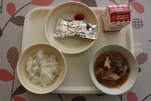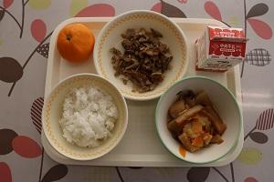 今日の給食は、ごはん、牛乳、にしんの塩焼き、きんぴらごぼう、みそ汁、一口ももゼリーです。給食のにしんの塩焼きは、骨ごと食べられるようにやわらかく調理してあります。カルシウムが多いので、骨や歯が強くなります。五目煮は大豆や季節の野菜がたっぷり入っています。よくかんで食べましょう。