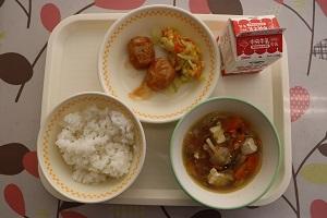 今日の給食は、ごはん、牛乳、揚げぎょうざ、そえやさい、豚肉とたっぷりやさいのスープです。豚肉には、ごはんなどに含まれる栄養をエネルギーにかえるのを助ける働きをする栄養素が多く、疲れをとる効果もあるので蒸し暑くなるこれからの季節にぴったりの食材です。豚肉とたっぷりやさいのスープには、にんじん、チンゲンサイ、たまねぎ、キャベツ、ぶなしめじ、しょうがが入っています。