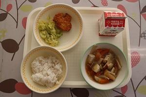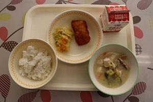 今日の給食は、ごはん、牛乳、とりの竜田揚げ、そえやさい、生揚げのくず煮です。生揚げのくず煮に入っているしいたけやたけのこには、お腹の調子を整える食物繊維が多く含まれています。生揚げは、カルシウムが多く、骨や歯を強くします。かつお節からとっただしを使って煮てあるので、うまみもたっぷりです。ぜひ味わって食べてください。