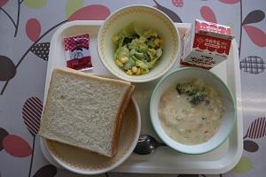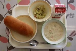 今日の給食は、フィッシュバーガー、牛乳、ポテトクリームスープです。ポテトクリームスープには、ペースト状にした白いんげん豆が入っています。白いんげん豆は、体をつくってくれるたんぱく質や熱や力になる炭水化物が多く、おなかのそうじをしてくれる食物繊維も多く含まれる食品で、世界中で食べられています。みなさんにも食べてほしい食品です。