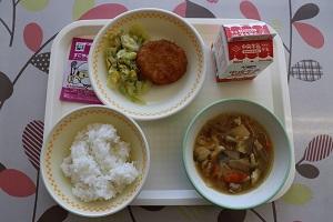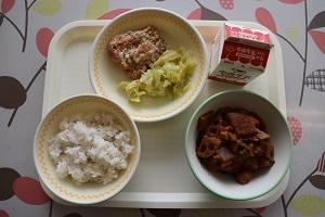 今日の給食は、ごはん、牛乳、星形ミンチカツ、そえやさい、すまし汁、七夕ゼリーです。そえやさいにはキャベツを使用しています。キャベツには、かぜを予防したり、胃を守ったりする働きがあります。7日の七夕の日にちなんで七夕ゼリー、すまし汁には星形のかまぼこが入っています。味わって食べましょう。