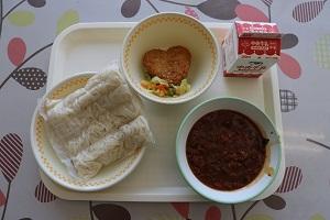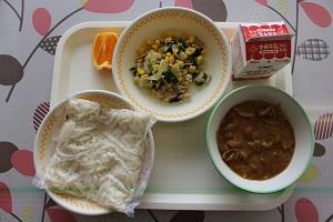 今日の給食は、チキン米粉カレーライス、牛乳、コーンサラダ、さつまいもチップスです。チキン米粉カレーライスには、大豆を粉にした大豆粉が入っています。大豆は、豆腐の原料にもなります。骨をつくる働きを助けてくれるため、骨が一番伸びる成長期にはぴったりの食材です。さつまいもチップスのさつまいもは、お腹の調子をよくする食べ物です。