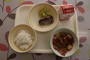 今日の給食は、ごはん、牛乳、さばのみそ煮、そえやさい、肉だんごとやさいのうま煮です。肉だんごとやさいのうま煮には、じゃがいも、にんじん、れんこん、生揚げ、肉だんごなどが入っています。さばなどの魚には、血液の流れをよくしたり、頭の働きをよくしたりする栄養素が含まれています。みそが魚の臭みをとり、ごはんに合うおかずとして、給食では人気のある献立です。