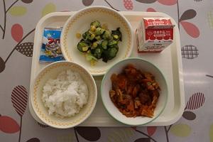 今日の給食は、ごはん、牛乳、オイスターソースいため、ピリ辛スープ煮 、味付乾燥豆腐です。ピリ辛スープ煮には、愛知県産の「アカモク」という海藻を使っただんごが入っています。味付乾燥豆腐は愛知県産のふくゆたかという大豆を使って作ってあります。よくかんで食べましょう。