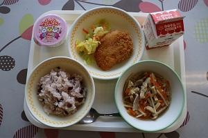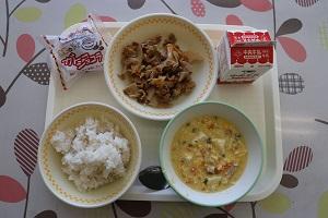 今日の給食は、米粉カレーライス、牛乳、ハムとやさいのいためもの、角チーズです。主食は、五穀ごはんです。五穀ごはんには、大麦、発芽玄米、黒米、もちきび、赤米が入っています。カレーライスには、大豆粉が入っています。大豆粉は大豆をくだいて粉にしているので、おいしさや栄養がアップします。