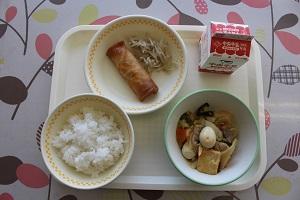 今日の給食は、ごはん、牛乳、春巻、もやしいため、八宝菜です。八宝菜には、豊橋産のうずら卵といか、豚肉、にんじん、たまねぎ、たけのこ、キャベツ、きくらげが入っています。豊橋市は、うずら卵の産地で有名です。うずら卵は栄養バランスがよく身長、体重がたくさん増える時期に食べるとよい食べ物です。よくかんで食べましょう。
