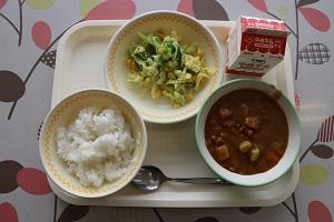 今日の給食は、米粉ドライカレー、牛乳、オムレツ、やさいのスープ煮です。ドライカレーは、ひき肉とたまねぎを水分がなくなるまでゆっくりいためて作ります。味付けに使うカレー粉には、食欲を増す働きがあります。今日の給食のドライカレーのカレールウは、小麦粉ではなく米の粉で作ってあります。
