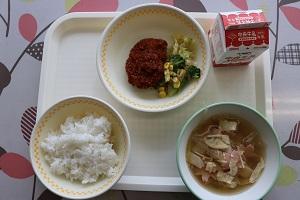 今日の給食は、ロールパン、牛乳、ハンバーグのケチャップソースかけ、そえやさい、コーンクリームスープです。ハンバーグは、体をつくるたんぱく質が多く含まれている肉を材料として作ります。かけるソースによっていろいろな味を楽しむこともできます。今日は、パンに合うようにケチャップ、ソース、砂糖を使って作ったケチャップソースをかけました。