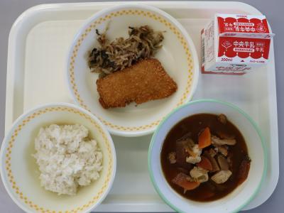 今日の給食はごはん、のりとかつおのふりかけ、牛乳、とり肉のさっくりフライ、そえやさい、じゃがいもの含め煮です。じゃがいもは炭水化物を多く含み、熱や力のもとになる食べ物です。じゃがいもは土の中で茎の部分が大きくなったものです。
