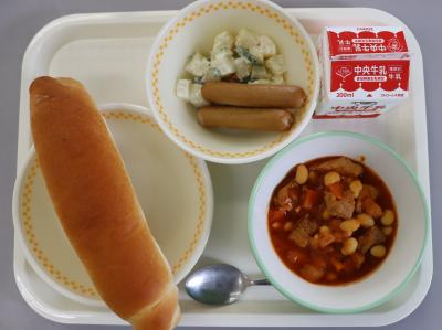 今日の給食は、チリドッグ、牛乳、やさいスープ、りんご、スティックチーズです。チリドッグの「チリ」は唐辛子のことで、トマトソースの中に唐辛子などの調味料を入れたピリ辛ソースのことをチリソースといいます。チリソースは、えびやいかなどの魚介類の煮込み料理や、サラダのドレッシングなどによくつかわれる調味料です。サンドイッチロールにチリドッグの具とスティックチーズをはさんで食べましょう。