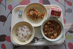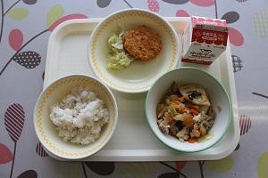 今日の給食は、ごはん、牛乳、いり豆腐、ごまだれ肉だんご、たけのこの土佐煮です。春が旬のたけのこは、成長がとても早く、10日ほどで竹になります。茹でたたけのこにつくことのある白いものは、たけのこに多く含まれているチロシンという栄養がとけだしたものです。チロシンはやる気を向上させる効果があるといわれています。土佐煮というのは、かつお節で煮た料理のことを言います。やわらかくておいしい旬のたけのこを食べましょう。