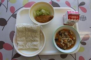 今日 の給食 は、ごはん、牛乳 、 春巻 、もやしいため、やさいの中華 クリーム煮 です。やさいの中華 クリーム煮 には牛乳 と生 クリー ムが入 っています。牛乳 は飲 むだけでなくいろいろな料理 に利用 されます。牛乳 から作 られる食 べ物 には、チーズや生 クリームなどがあります。牛乳 には、骨 や歯 を丈夫 にするカルシウムという栄養素 が多 く含 まれています。