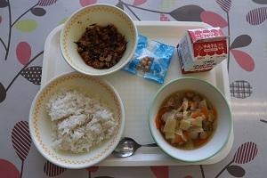 今日 の給食 は、麦 ごはん、牛乳 、しゅうまい、バンサンスー、マーボー豆腐 です。マーボー豆腐 は、豆腐 がたっぷり入 っています。豆腐 には、丈夫 な骨 をつくるカルシウムや記憶力 や集中力 を高 める栄養素 が含 まれています。また、かくし味 にしょうがが入 っています。しょうがは、せきを止 めたり、体 を温 めたり、薬 のような効果 もあります。しっかり食 べて、丈夫 な体 をつくりましょう。