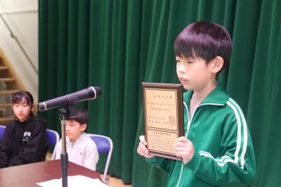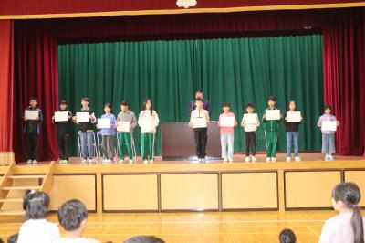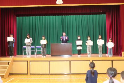 朝礼の中で,2学期に取り組んだ理科スケッチ展や夏休みに取り組んだ作品で優秀な成績を収めた子の表彰を行いました。
