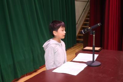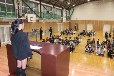 終業式では,3年生と6年生の代表の子が,2学期を振り返って,授業や行事などでがんばってきたことや,3学期にむけてがんばりたいことを,堂々と発表しました。