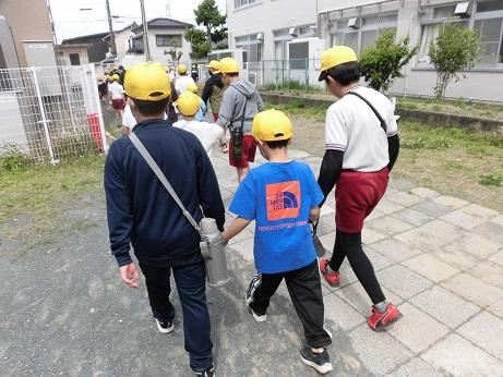 1年生と6年生が手をつないで、多米公園に手つなぎ交流に出かけました。気持ちのよい天気の中、お兄さん、お姉さんに手を引かれながら、楽しく歩きました。