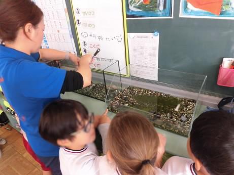 水槽の周りに子どもたちが集まってきました。子どもたちが注目する中、引っ越し完了!