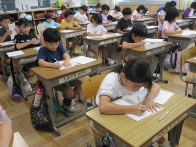 「おさない はしらない しゃべらない もどらない」 を合い言葉に、教室からの避難経路を確認し、訓練を体験しました。揺れを感じたら、近くの教室に入り、机の下に入ること、その際にしっかり机の脚をもつことなどを教室で学習し、特に1年生は初めての避難訓練になりました。子どもたちは、頭をまもりながら、落ち着いて素早く行動することができました。
