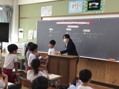 近隣の園児のみなさんと1年生が交流しました。1年生もよきお兄さん、お姉さんとして活動しました。給食もいっしょに食べました。「もうすぐいっしょにべんきょうするよ」心で伝えながら交流しました。きっと伝わったと思います。