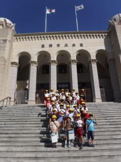 子どもたちが立つ位置の目印となります。そして、この赤テープ上に位置をとることで、ソーシャルディスタンスを確保することができるようになっています。