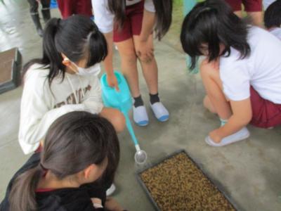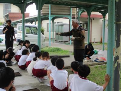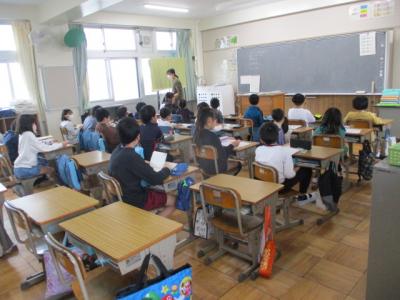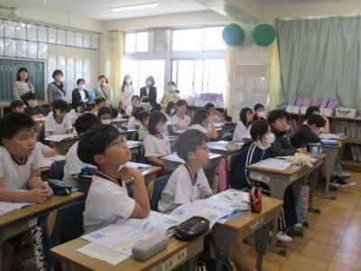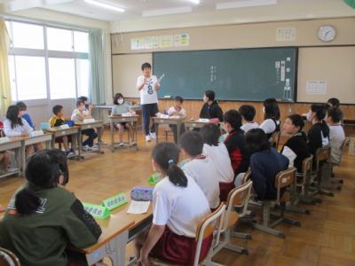 5年生が、愛知の水産業について出前授業を受けました。沖合底びき網漁の様子などを動画で見たり、タッチプールで三河湾にいる生物に触れたりするとても楽しい経験を通して、私たちがたくさんの海の恵みを受けていることを知りました。水産業の大変さも知り、限りある海の資源を大切にしていきたいという思いを強くもちました。