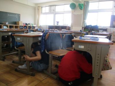 昨日、掃除の時間に地震が起きた想定で抜き打ちの避難訓練を行いました。突然、緊急地震速報が流れ、戸惑う子どもたち。教室、廊下、運動場などで掃除をしている子どもたちは、近くの教室に入って机の下に身を隠したり、小さくなって頭を抱えて座ったりして、身を守る行動をとりました。